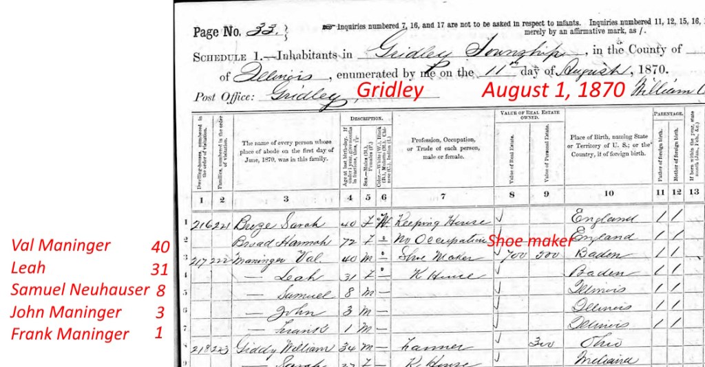 - Census – Val and Lena Maninger – Gridley Illinois – 1870 – ancestry.com – https://www.ancestry.com/imageviewer/collections/7163/images/4263697_00334?pId=16813459