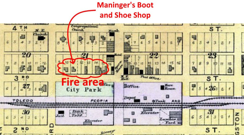 The Maninger family moved from Gridley to their farm north of Meadows. Since they moved, no one was in the shoe shop building after business hours.