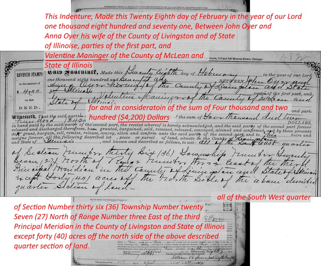 - Deed – Valentine Maninger from Joseph and Anna Oyer – Livingston County Recorder – Livingston County IL – Deed – v. 51-52 1872 v. 53 (warranty deeds) 1871-1872 – Book 52, Page 1 Feb 28, 1871 SE 36 27 3 Film 1401726, Group 8567085, Image 99 – https://www.familysearch.org/ark:/61903/3:1:3Q9M-C3QY-83C5?i=98&cat=451136