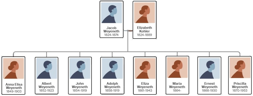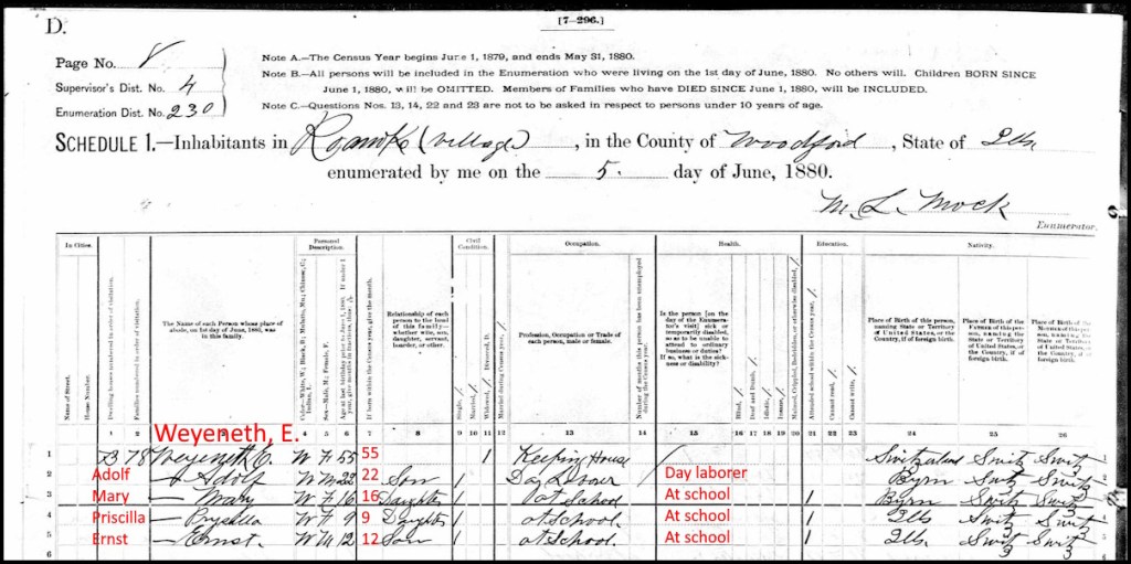 The Weyeneth family immigrated with seven children, all born in Switzerland. On August 30, 1870, just a few months after they arrived in Illinois, a daughter Priscilla was born.