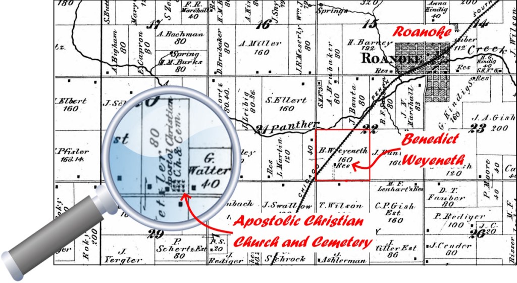 Recall that Benedict Weyeneth was the first elder of the Apostolic Christian Church in America. He and his wife and family settled in Roanoke, Woodford County, Illinois around 1857.