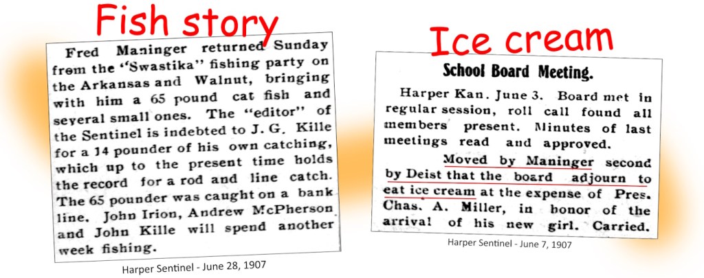 - News – Various articles for bad and good news – Harper Sentinel and Harper Advocate – various dates – 1906-1908 – newspapers.com