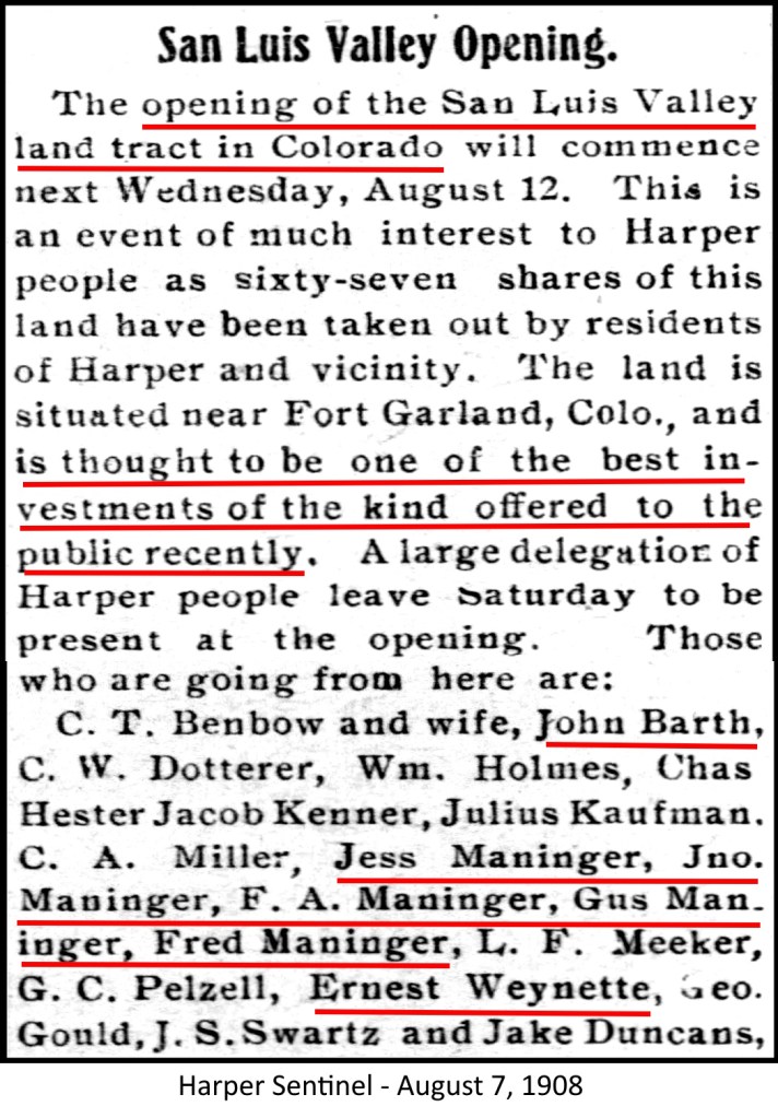 - News – Harper investors in San Luis Valley Land Company – Harper Sentinel – August 7 and Harper Advocate – August 28, 1908 – newspapers.com