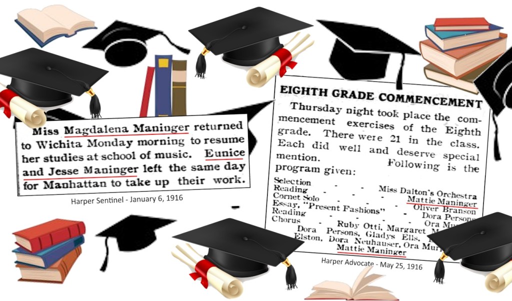 1916 had some significant school events. Mattie graduated in 8th grade. Other Maningers were off to college or vocational schools. Emily graduated from high school.