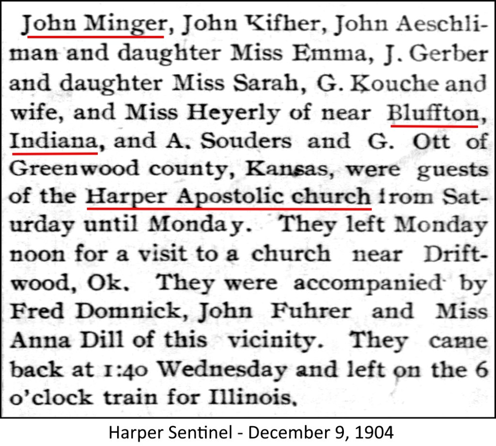 Curly Minger’s family was associated with the Bluffton Apostolic Christian Church. His father John Minger had visited Harper with a group from the Bluffton church in 1904.