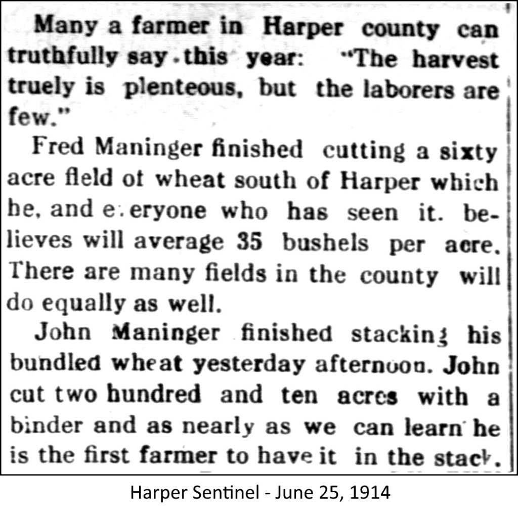 In March 1914, investors founded the Harper Oil and Gas Company to explore for oil around Harper. Each investor agreed to give oil leases on their farms, a total of 30,000 acres. The Maningers were all in.