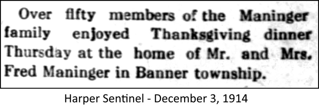 - News – Maninger Thanksgiving at Fred’s – Harper Sentinel – December 3, 1914 – newspapers.com