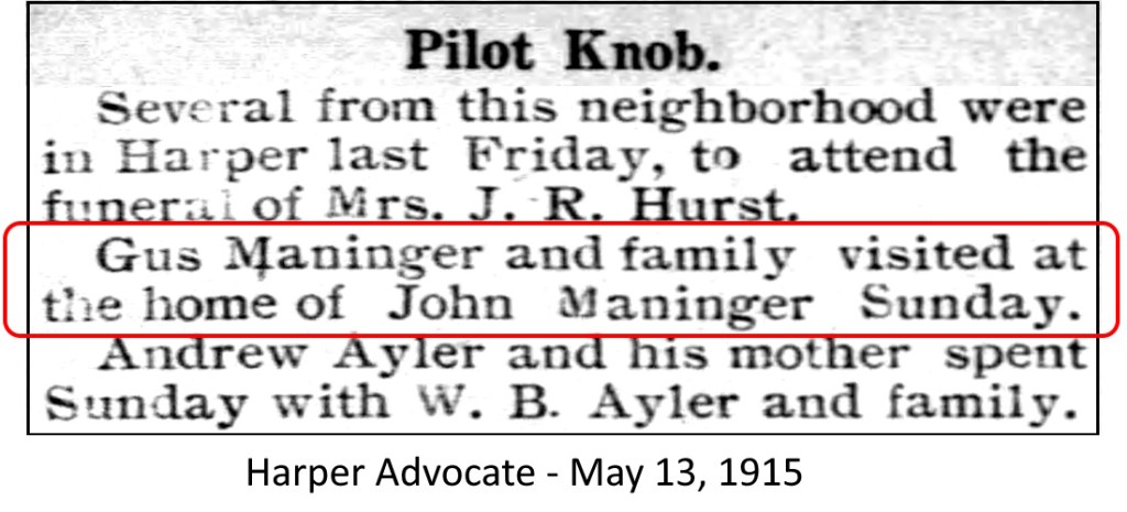 - News – Gus Maninger family visits John Maninger family – Harper Advocate – May 13, 1915 – newspapers.com