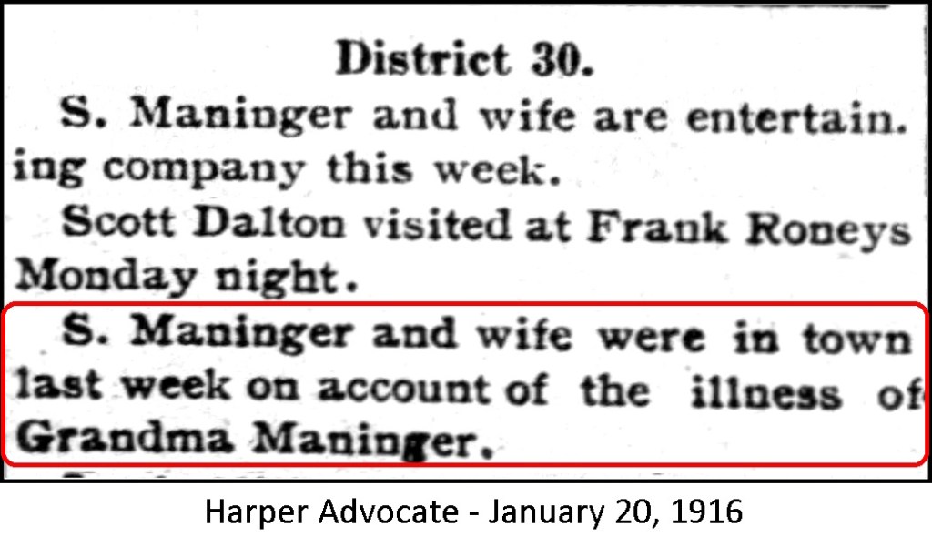 - Obituary – Magdalena Maninger – Harper Sentinel – April 20, 1916 – newspapers.com