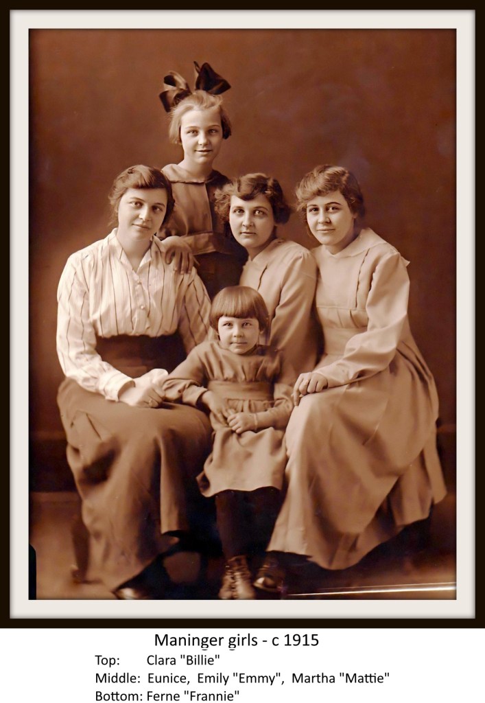 Here’s a studio portrait of the Maninger girls, daughters of John and Priscilla. It was taken around 1915, probably at Jennings Studio. Professional photographers had been plying their craft for decades.