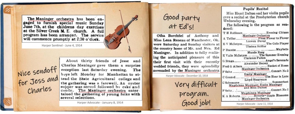 - News – Maninger Orchestra articles – Harper Advocate and Harper Sentinel – various dates – newspapers.com