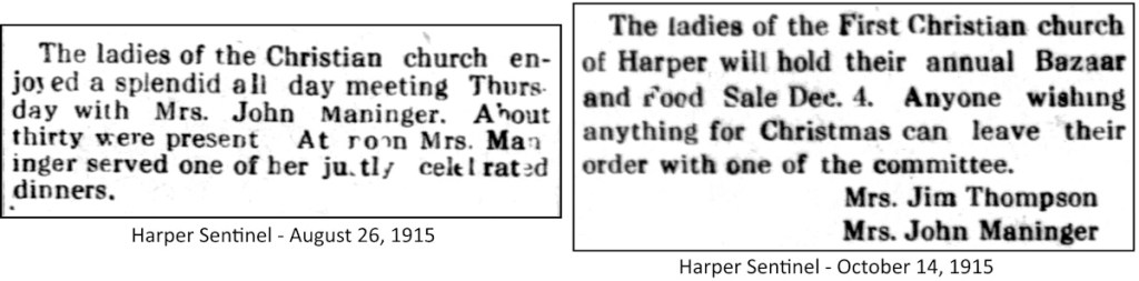 - News – Priscilla involved in First Christian Church – Harper Sentinel – August 26, 1915, and October 14, 1917 – newspapers.com