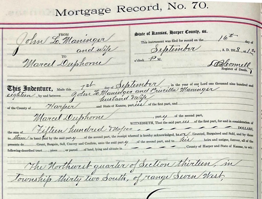 - Mortgage deed – John and Priscilla Maninger to Marcel Duphorne – September 1, 1918 – Harper County Register of Deeds – Anthony, Kansas