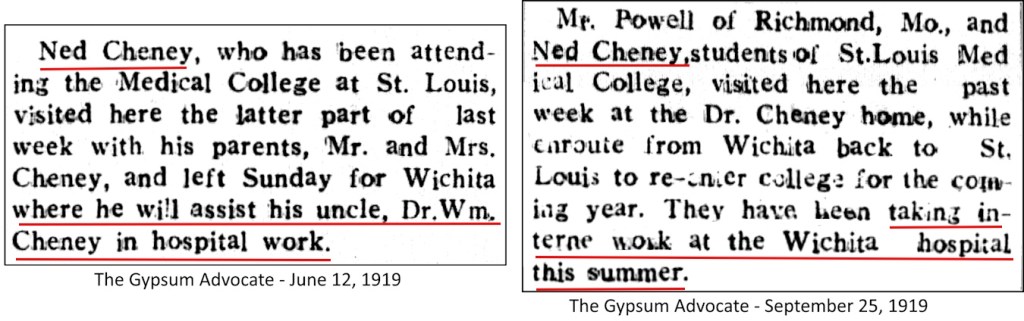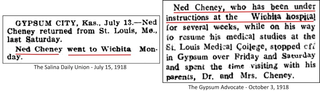 Next, let’s check out a few news articles. In summer 1918, Ned Cheney spent time “under instructions at the Wichita Hospital.”