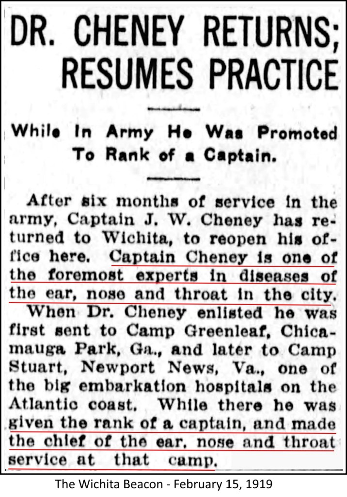 - News – Dr. J.W. Cheney resumes practice – The Wichita Beacon – February 15, 1919 – newspapers.com