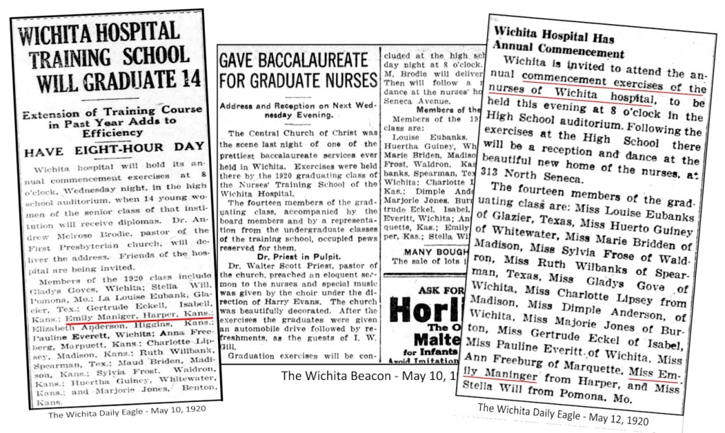 - News – Articles about Wichita Hospital graduation – The Wichita Daily Eagle and The Wichita Beacon – various dates in May 1920 – newspapers.com