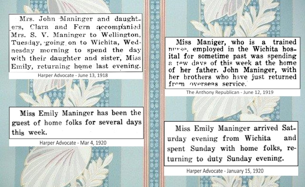 - News – Articles about visits to Emily in Wichita and her visits home – Harper Advocate and The Anthony Republican – various dates 1917-1920 – newspapers.com