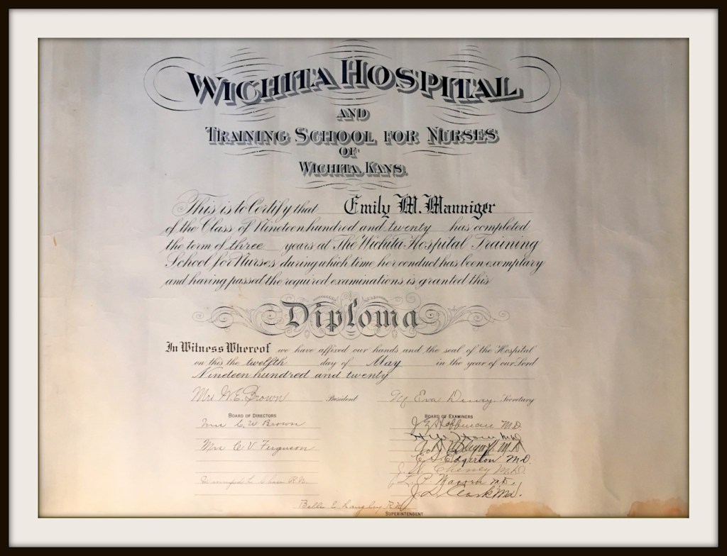 - Diploma – Emily Maninger – Wichita Hospital and Training School for Nurses – 1920 – Maninger family documents – Emily Maninger Cheney collection