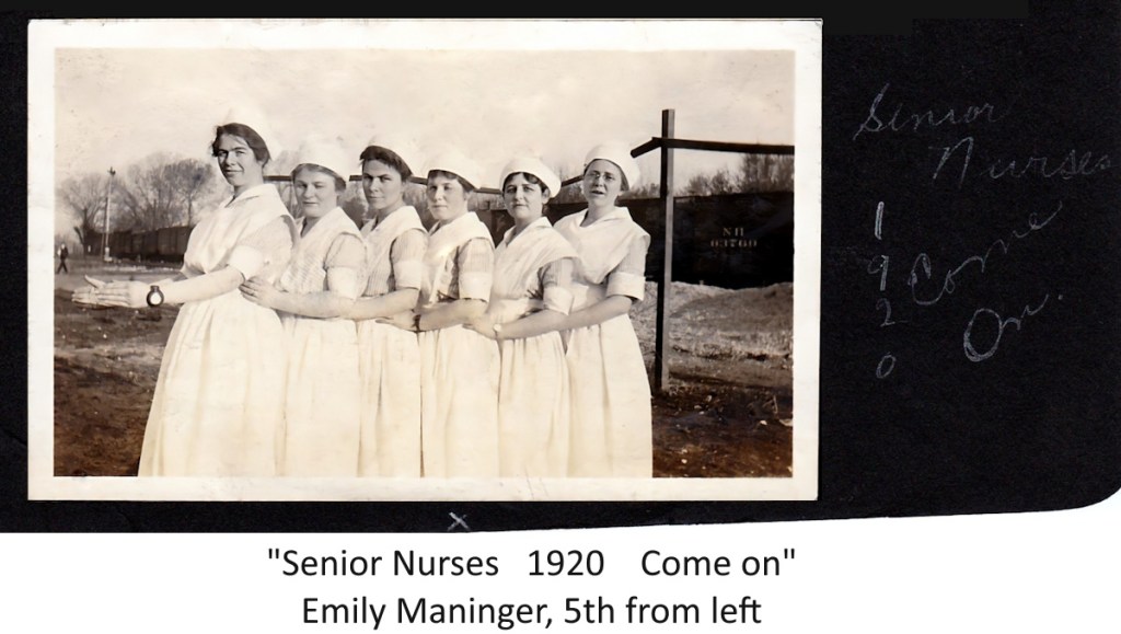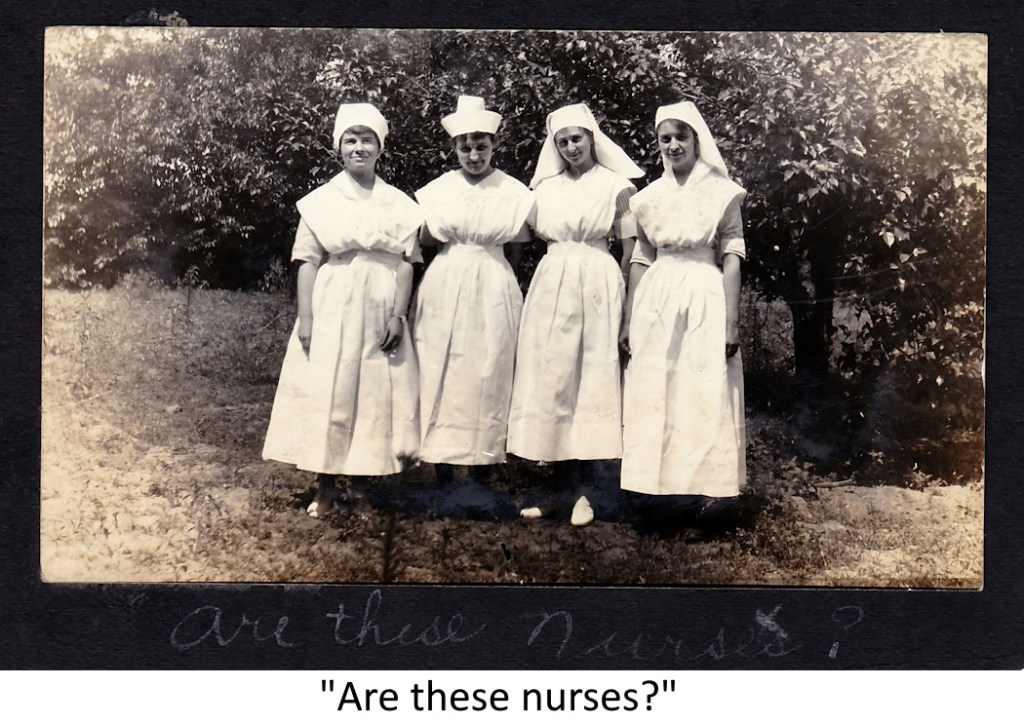 No, they’re not all nurses. In this photo from Eunice’s album, I think the girls are Magdalena, Emily, Elsie, and Eunice Maninger. Emily is the only nurse. I’m guessing that the other girls may have had the uniform of aides or helpers, like Candy Stripers or Red Cross aides.