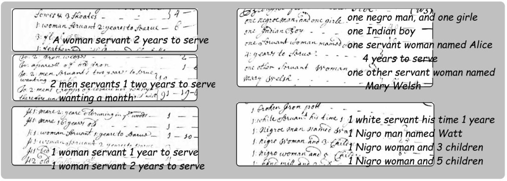 - Image – Various Inventories listing servants and slaves – composite from Inventories similar to Richard Cheney – Inventories and Accounts of Estates, Vol 8-11, 1683-1692 and 1700 – page 609 – Ancestry.com