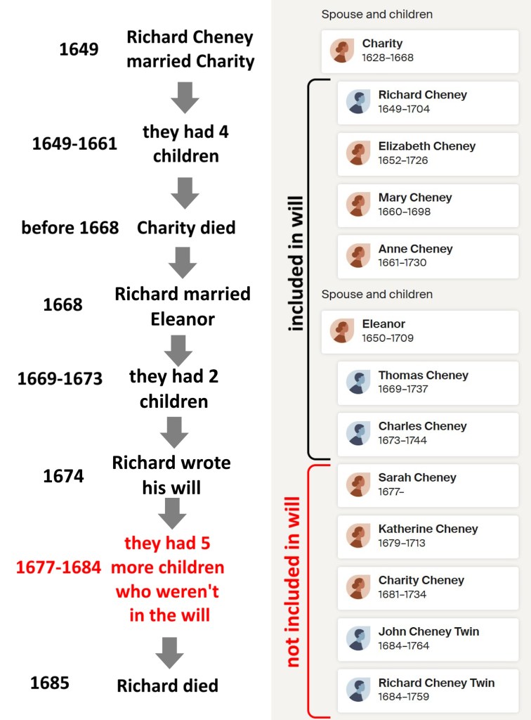 The five youngest Cheney children weren’t in the will, as they were born after the will was written. At Richard’s death, they ranged in age from one to eight years. They no doubt stayed with their mother Eleanor, who shared some of Richard’s estate with sons Charles and Thomas.