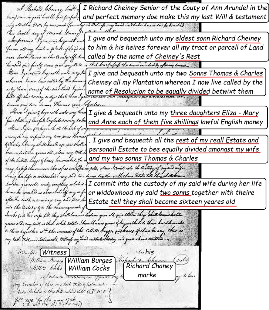 - Quote – Lawsuit of Richard Cheney will – Anne Arundel Gentry: A Genealogical History of Twenty-two Pioneers of Anne Arundel County, Md., and Their Descendants – Harry Wright Newman – Page 348 – https://archive.org/details/annearundelgentr00newm_0/page/348/mode/2up?q=cheney