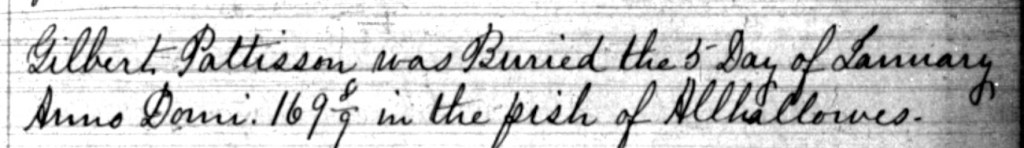- Death – Gilbert Pattison – 1699 – All Hallows Parish – Maryland State Archives – page 10 – Image 39 – https://msa.maryland.gov/megafile/msa/speccolm/scm200/scm221/000001/000001/pdf/msa_scm221.pdf
