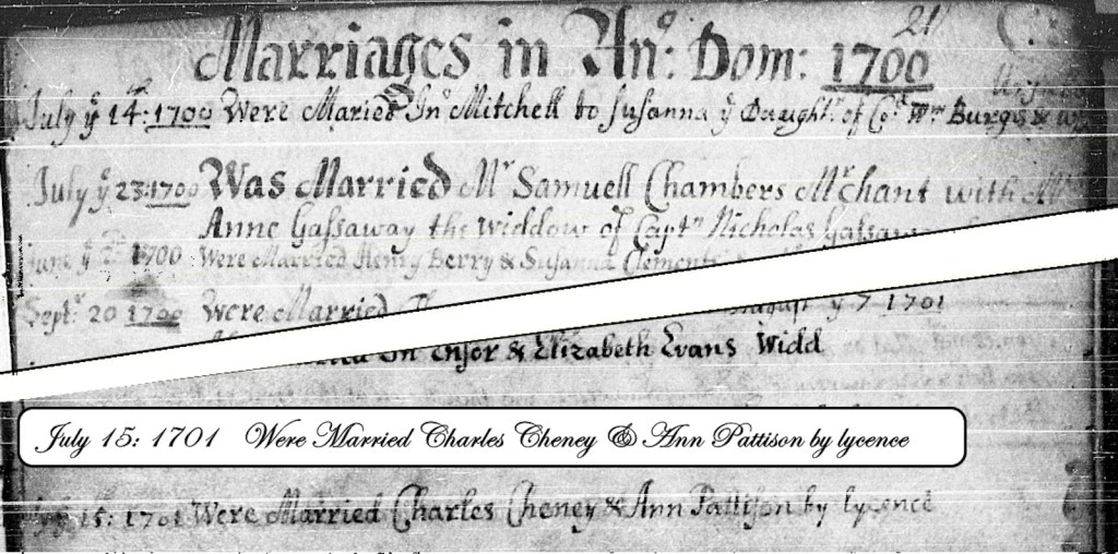 On July 17, 1701, Charles Cheney married Anne Jones Pattison. Charles was age 28, Anne a few years younger. Charles and Anne are our 7th great-grandparents.