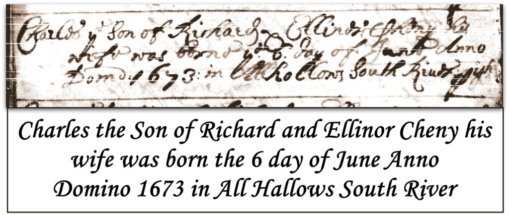 - Birth – Charles Cheney’s birth – All Hallows Parish Register – Maryland State Archives – https://msa.maryland.gov/megafile/msa/speccolm/scm200/scm221/000001/000001/pdf/msa_scm221.pdf
