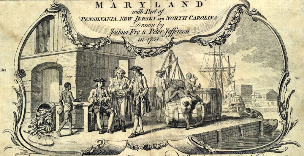 - Image – Map cartouche showing a ship loading tobacco – A map of the most inhabited part of Virginia containing the whole province of Maryland with part of Pensilvania, New Jersey and North Carolina – Library of Congress – https://www.loc.gov/resource/g3880.ct000370/?r=0.709,0.424,0.279,0.234,0