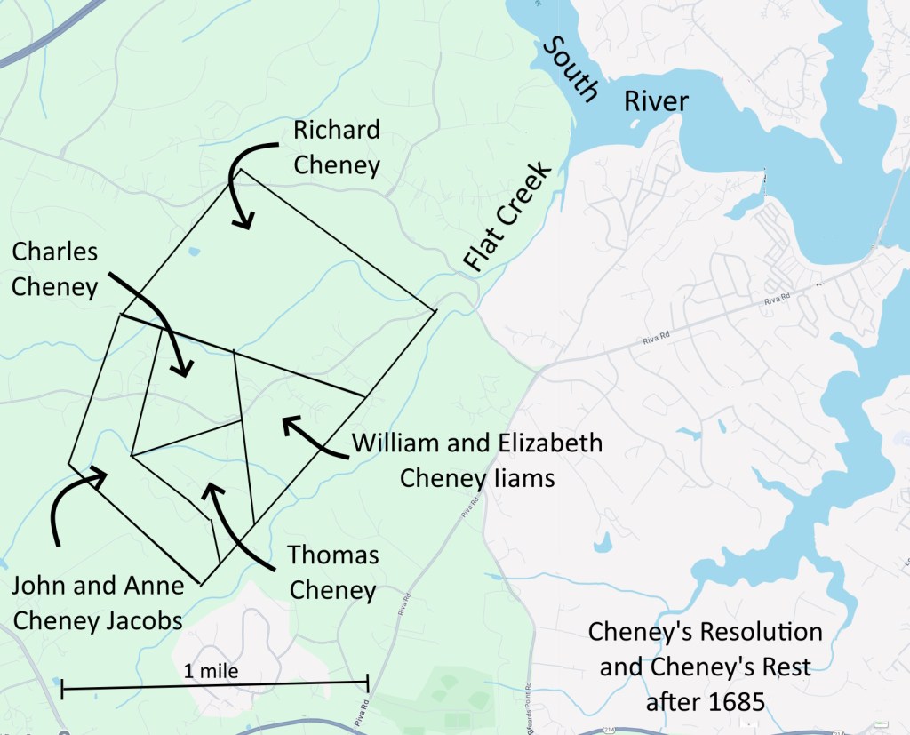 Richard Cheney’s will and earlier gifts to his daughters divided his land holdings. His largest holdings, Cheney’s Resolution and Cheney’s Rest consisted of 700 acres. These two patents were divided among five children.