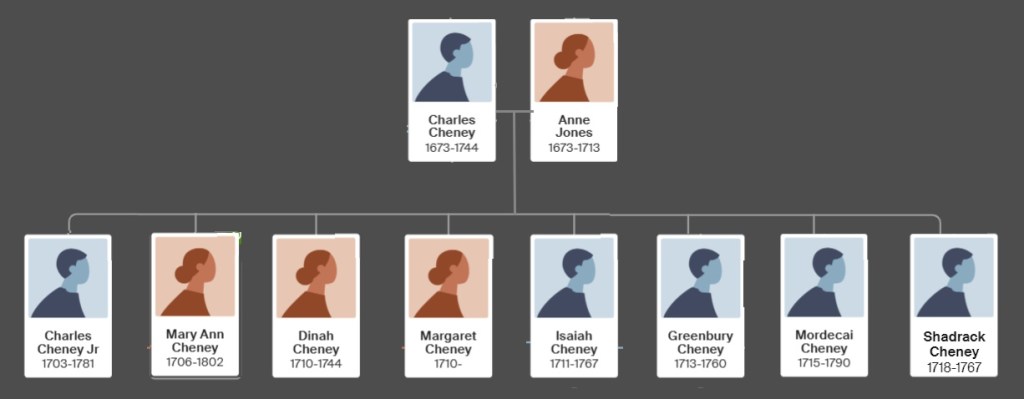 Charles Cheney was born Friday, June 6, 1673. He was the second of seven children of Richard and Eleanor Cheney. Richard also had four children from his first wife Charity. Charles Cheney is our 7th great grandfather.