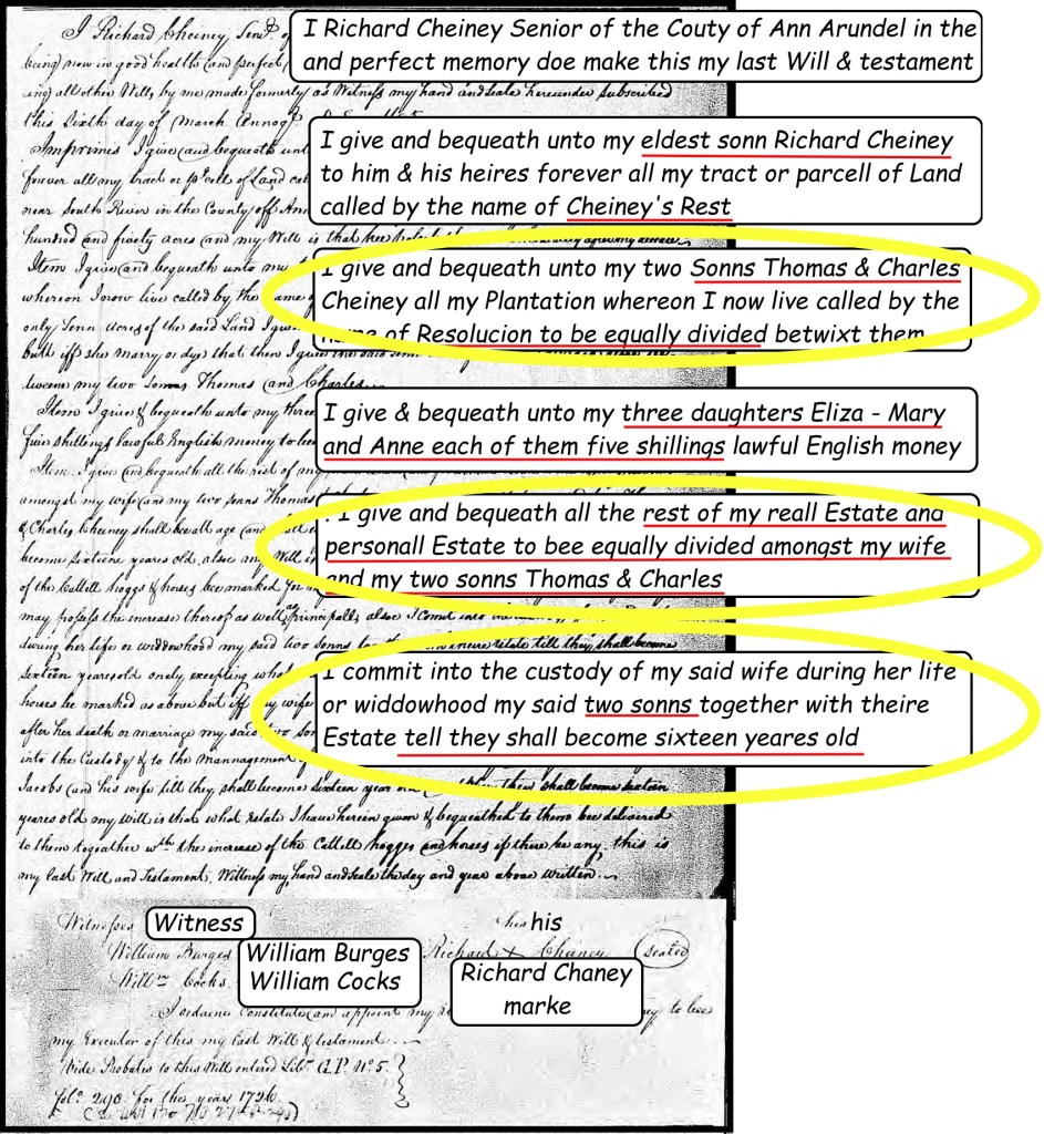 Richard had already given each of his daughters Elizabeth and Mary 100 acres of Cheney’s Resolution before he died. In his will, he gave his eldest son Richard 250 acres of the patent Cheney’s Rest.