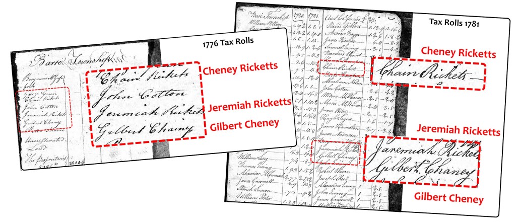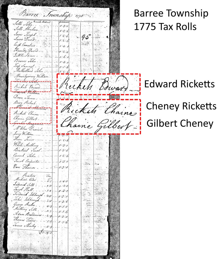 - Gilbert Cheney appears on 1775 Barree Township tax rolls alongside Cheney Ricketts and Edward Ricketts.