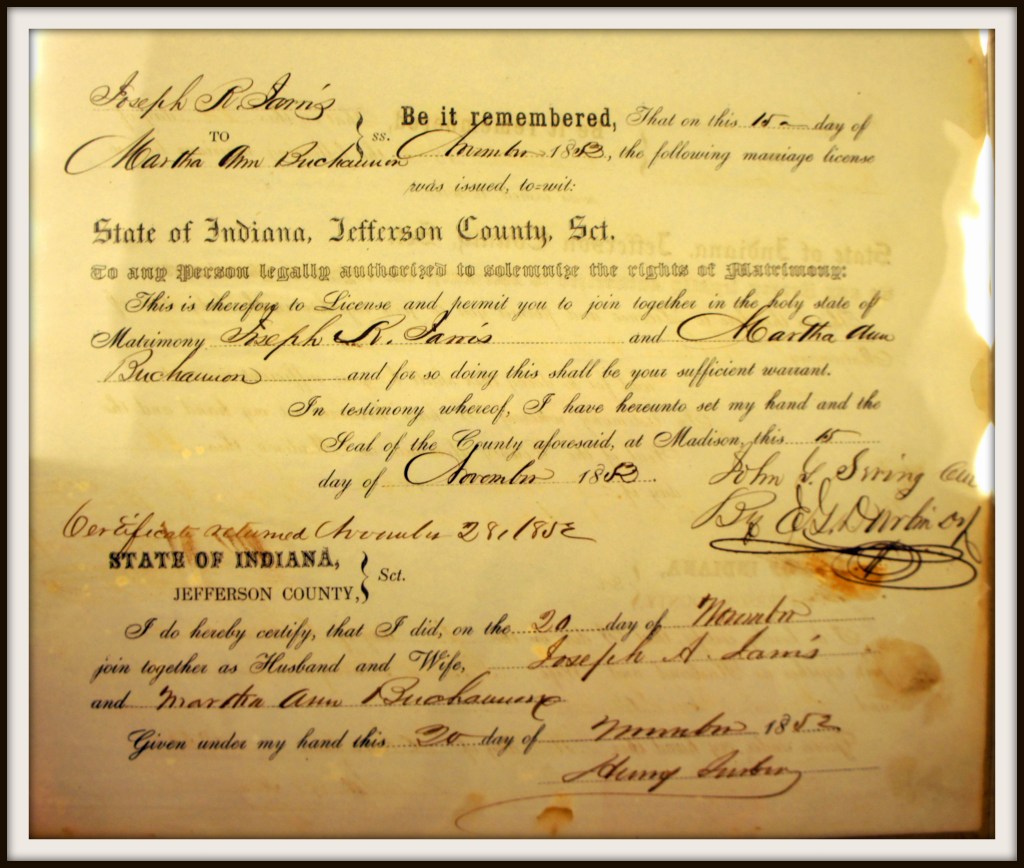 - Image – Marriage license of Joseph Jarvis and Martha Buchanan – 1852 – Jefferson County Clerk, Madison, Indiana
