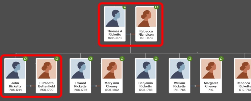 We’ve seen that the Cheneys had a close relationship with the Ricketts family in Anne Arundel County, Maryland. Several of Charles and Anne Cheney’s daughters married sons of Thomas and Rebecca Ricketts.
