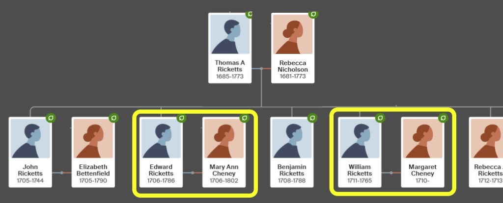 When I find a source document with the name Cheney Ricketts and the name of another Cheney family member, it suggests of a relationship between Cheney descendant families.