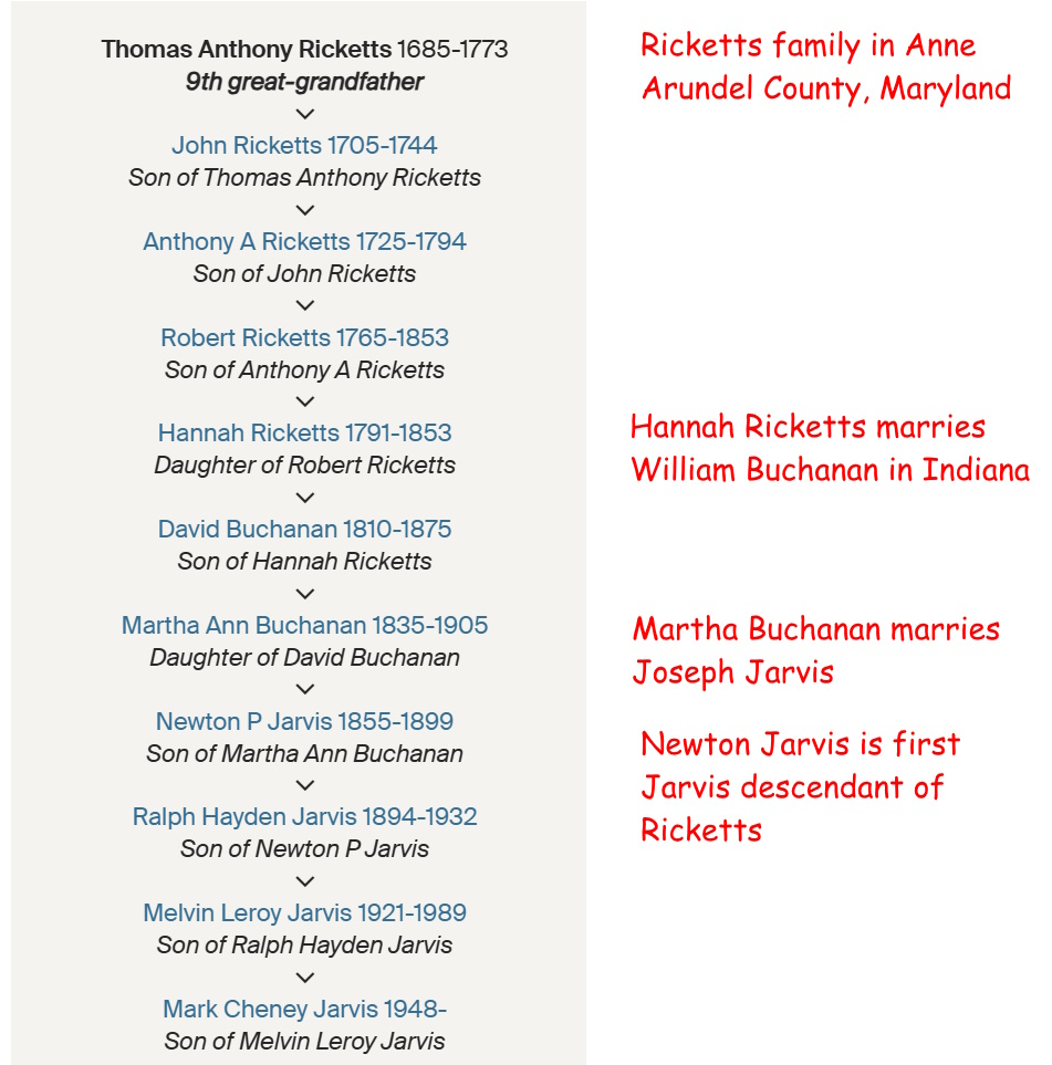 In 1852, Joseph Jarvis married Martha Buchanan in Jefferson County, Indiana. Martha’s grandmother was Hannah Ricketts. Hannah was a descendant of the Thomas and Rebecca Ricketts of Anne Arundel County, the same Ricketts family that intermarried with Cheneys.