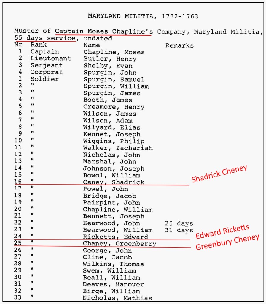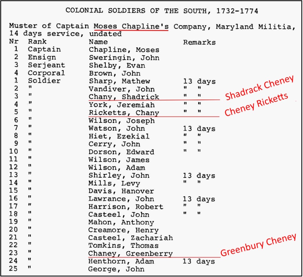 For example, Cheney Ricketts and Shadrack and Greenbury Cheney are listed in Captain Moses Chapline’s Company for a 13 day deployment.