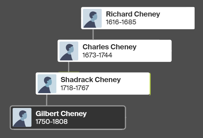 - Gilbert is likely a grandson of Charles Cheney and great-grandson of Richard Cheney, consistent with generational spacing.