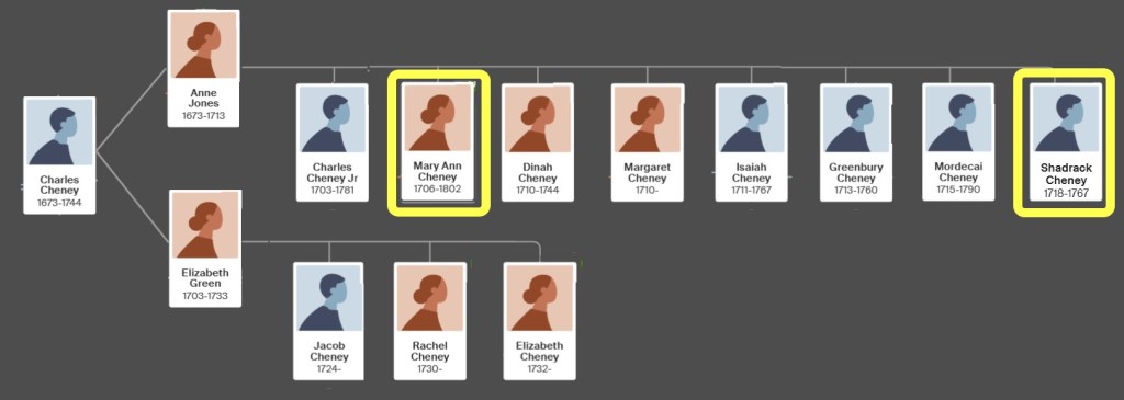 I’m hypothesizing that Gilbert Cheney is a grandchild of Charles Cheney, and a great-grandchild of patriarch Richard Cheney. Furthermore, I’m postulating that Charles Cheney’s son Shadrack is Gilbert Cheney’s father.