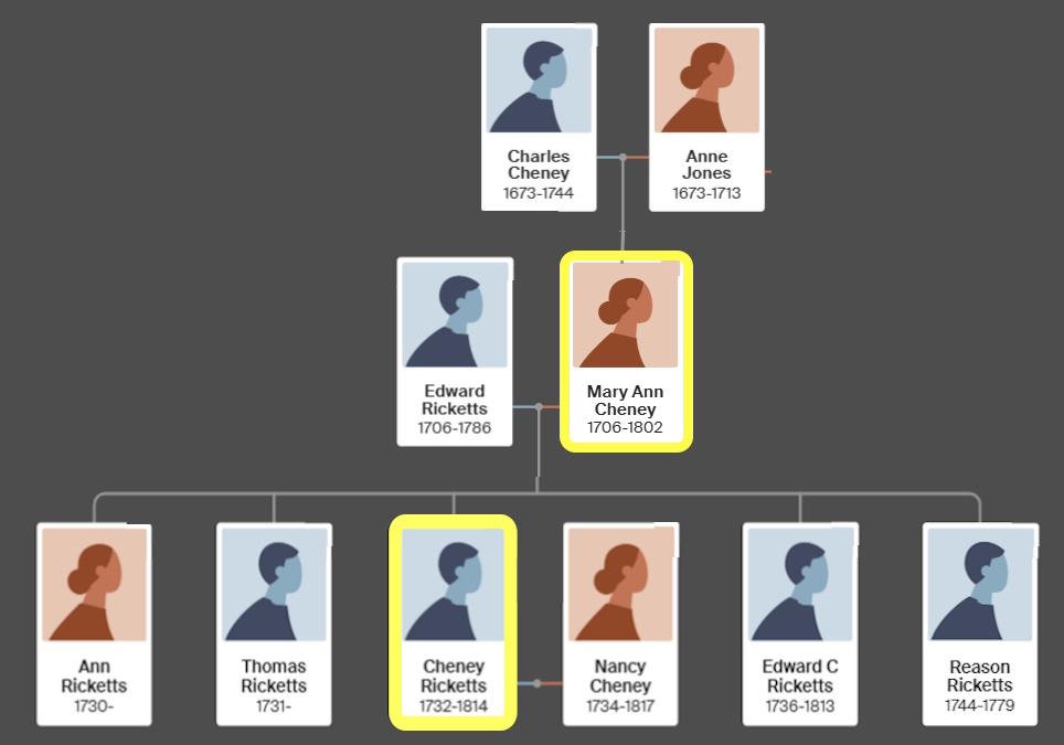- These Ricketts are confirmed grandchildren of Charles Cheney through his daughter Mary Ann.