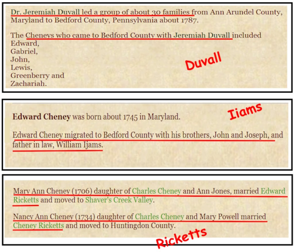 Other Cheney descendant families settled in this area – Iiams, Ricketts, Duvalls, and others. These families were related to the Cheneys of Anne Arundel.