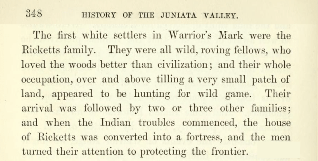 - Image – Ricketts living in wilderness reference – History of the Early Settlement in the Juniata Valley – U.J. Jones – 1856 – https://archive.org/details/historyofearlyse00jone/page/348/mode/2up?view=theater&q=ricketts