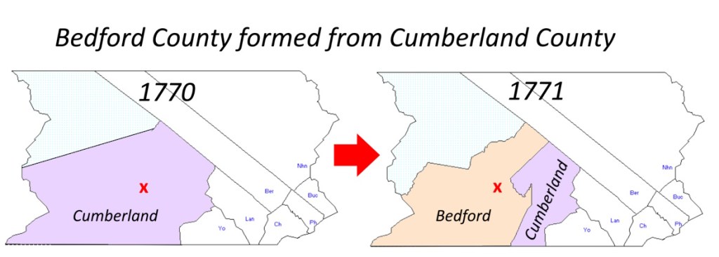 - Map – Bedford County formed from Cumberland County – Interactive Map of Pennsylvania County Formation History – https://www.mapofus.org/pennsylvania/
