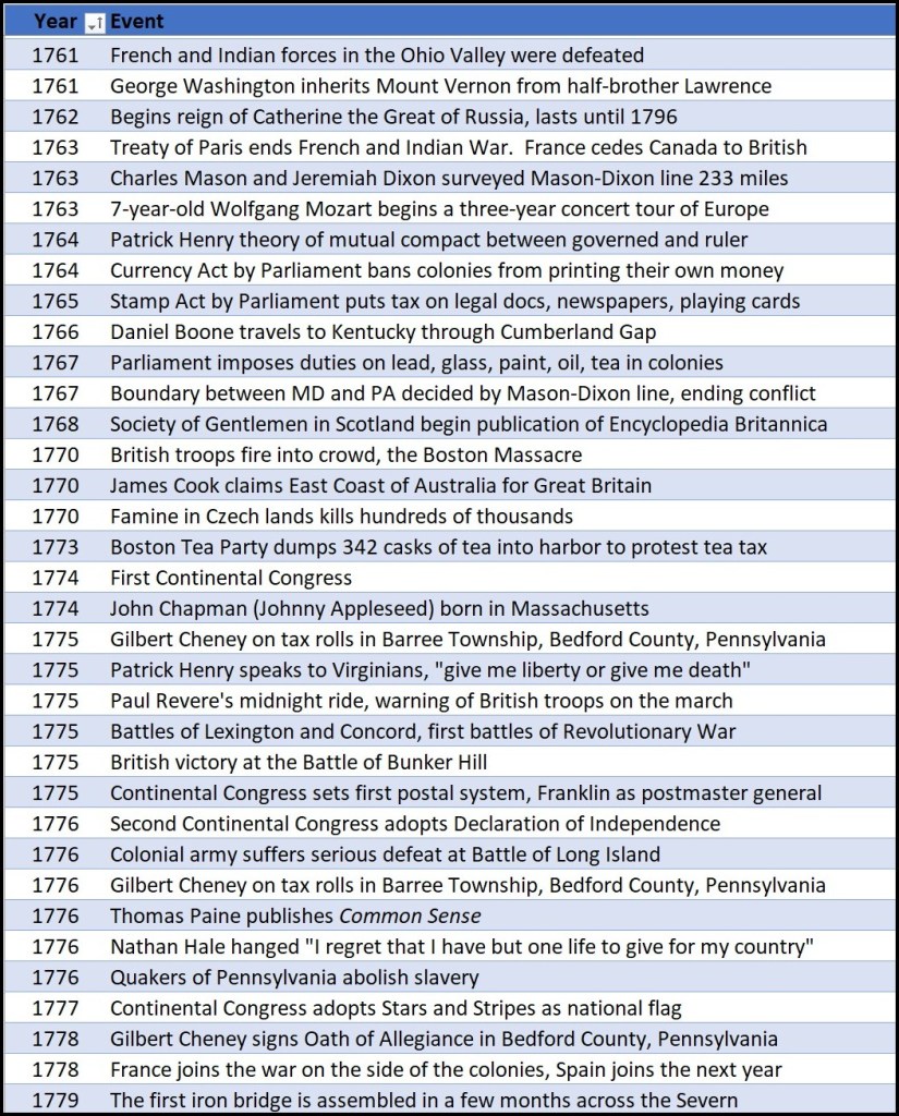 In spite of the hardships, the Cheneys and Ricketts and other families persevered. By the 1770s, there were the trappings of civilization – county organization, courts, censuses, and taxes.