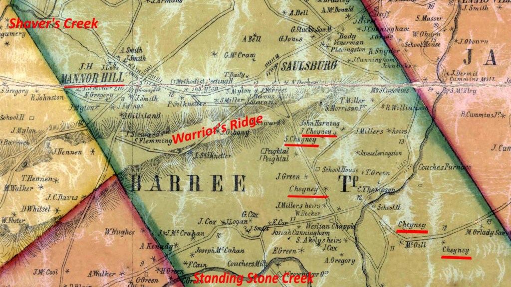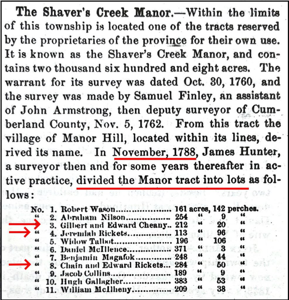 - Book excerpt – Shaver’s Creek Manor surveyed Cheney Lot 3 – A History of Huntingdon and Blair Counties, Pennsylvania – J. Simpson Africa – 1883 – https://archive.org/details/historyofhunting00afri/page/n1/mode/2up