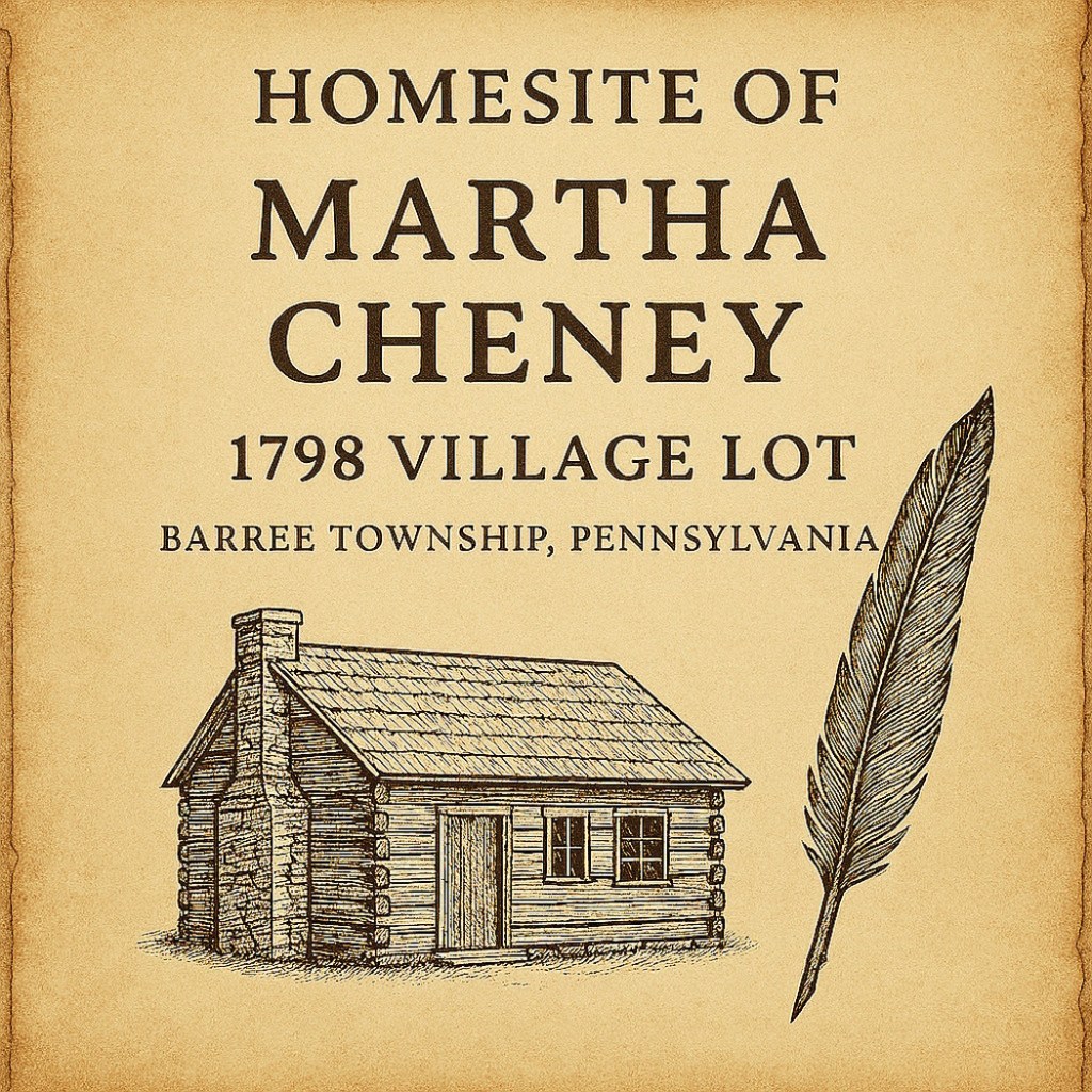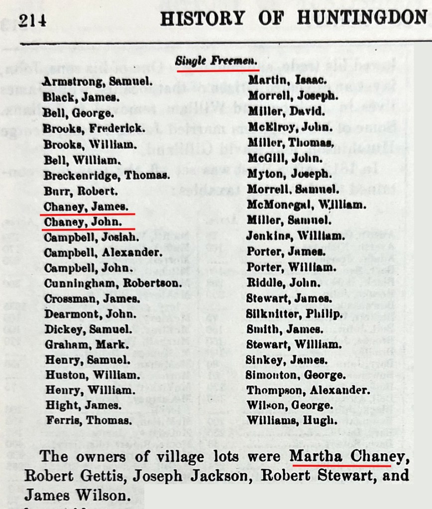 - Book excerpt – Martha Cheney has village lot – A History of Huntingdon and Blair Counties, Pennsylvania – J. Simpson Africa – 1883 – https://archive.org/details/historyofhunting00afri/page/n1/mode/2up