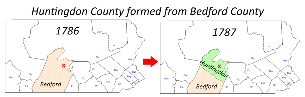 - Map – Huntingdon County formed from Bedford County – Interactive Map of Pennsylvania County Formation History – https://www.mapofus.org/pennsylvania/