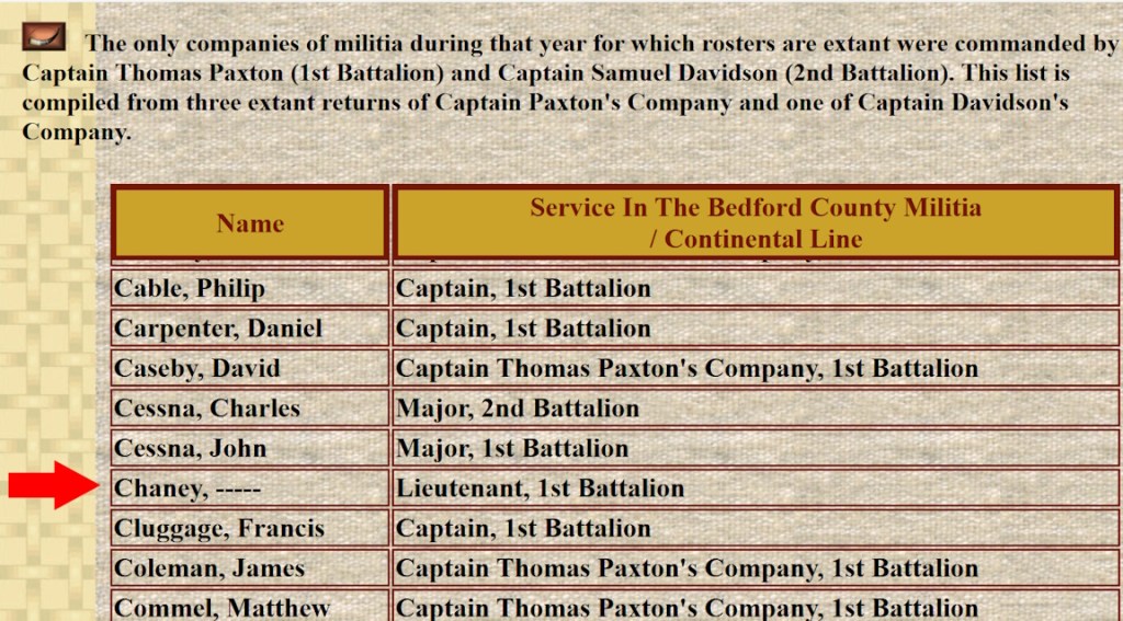 The records for the Bedford County Militia aren’t complete. I can’t find a record for Gilbert Cheney being in the militia. There’s a Lt. Chaney listed, but no first name.